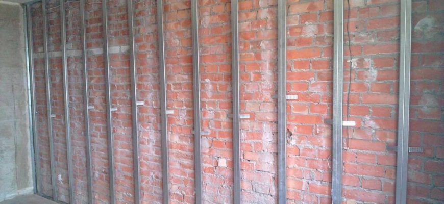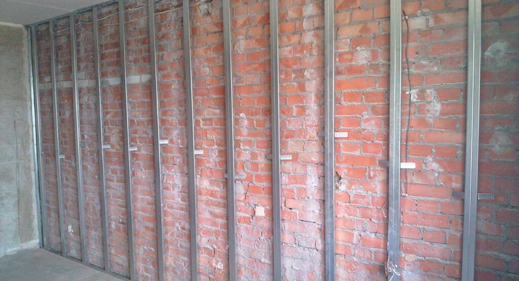 Следующий этап – установка каркаса. Используйте металлические профили. Зафиксируйте их на стенах с помощью дюбелей, соблюдая вертикаль с помощью уровня. Не забывайте о расстоянии между профилями – стандартные отступы составляют 60 см.
