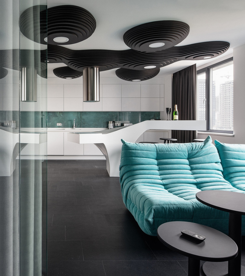 Линейные светильники и светодиоды отлично вписываются в концепцию. Их можно встраивать в потолок для создания иллюзии «плавающего» света. Светильники могут быть с возможностью изменения цвета, что позволит варьировать атмосферу в любое время суток.