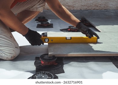 - Проверяйте уровень укладки по каждой плитке с помощью уровня.