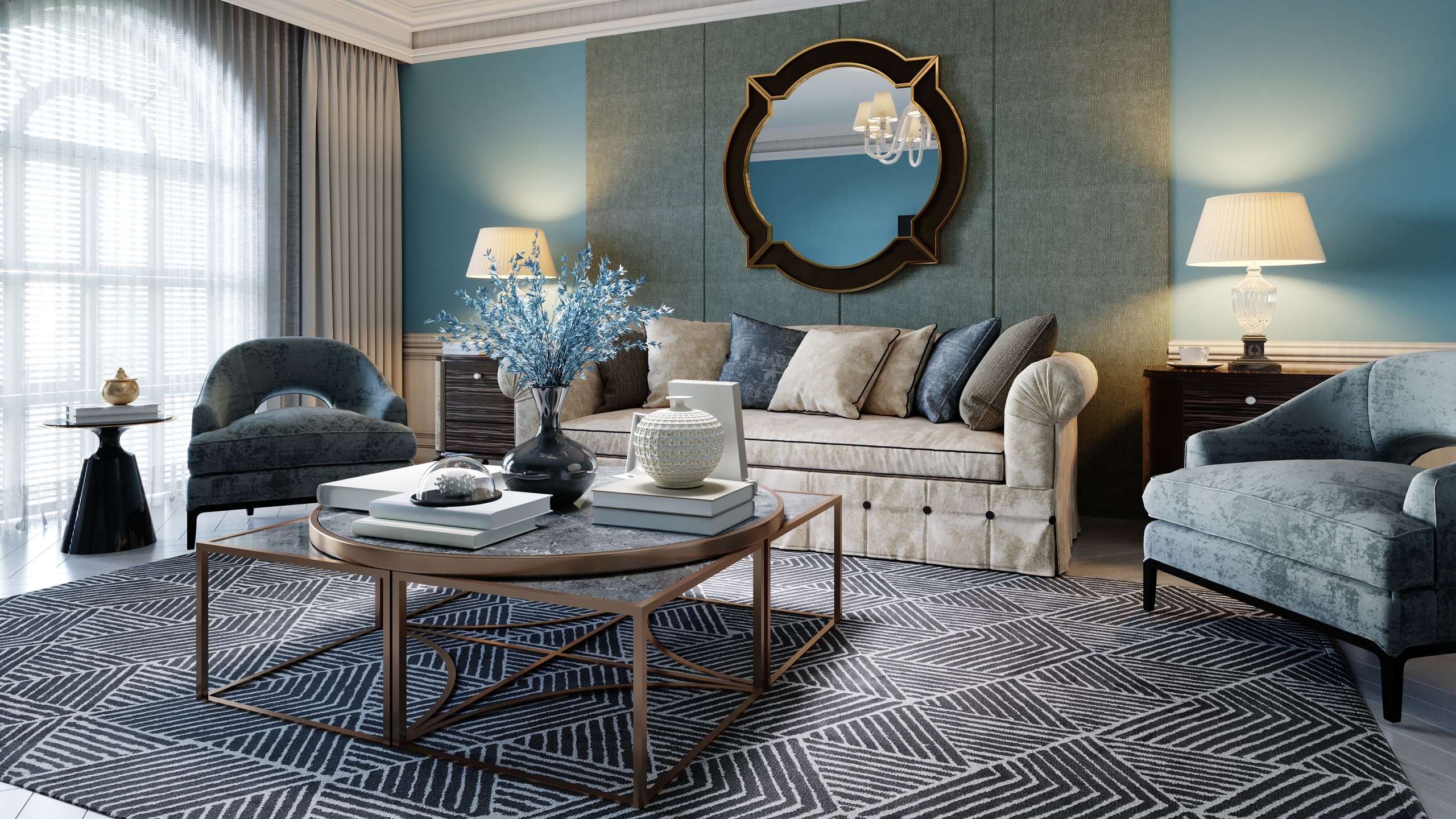 После этого добавьте разнообразие с помощью глубоких синих и зеленых оттенков, отражающих моря и хвойные леса. Темные и светлые оттенки синего, а также оливковые или бирюзовые акценты обогатят пространство, создавая ощущение свежести.